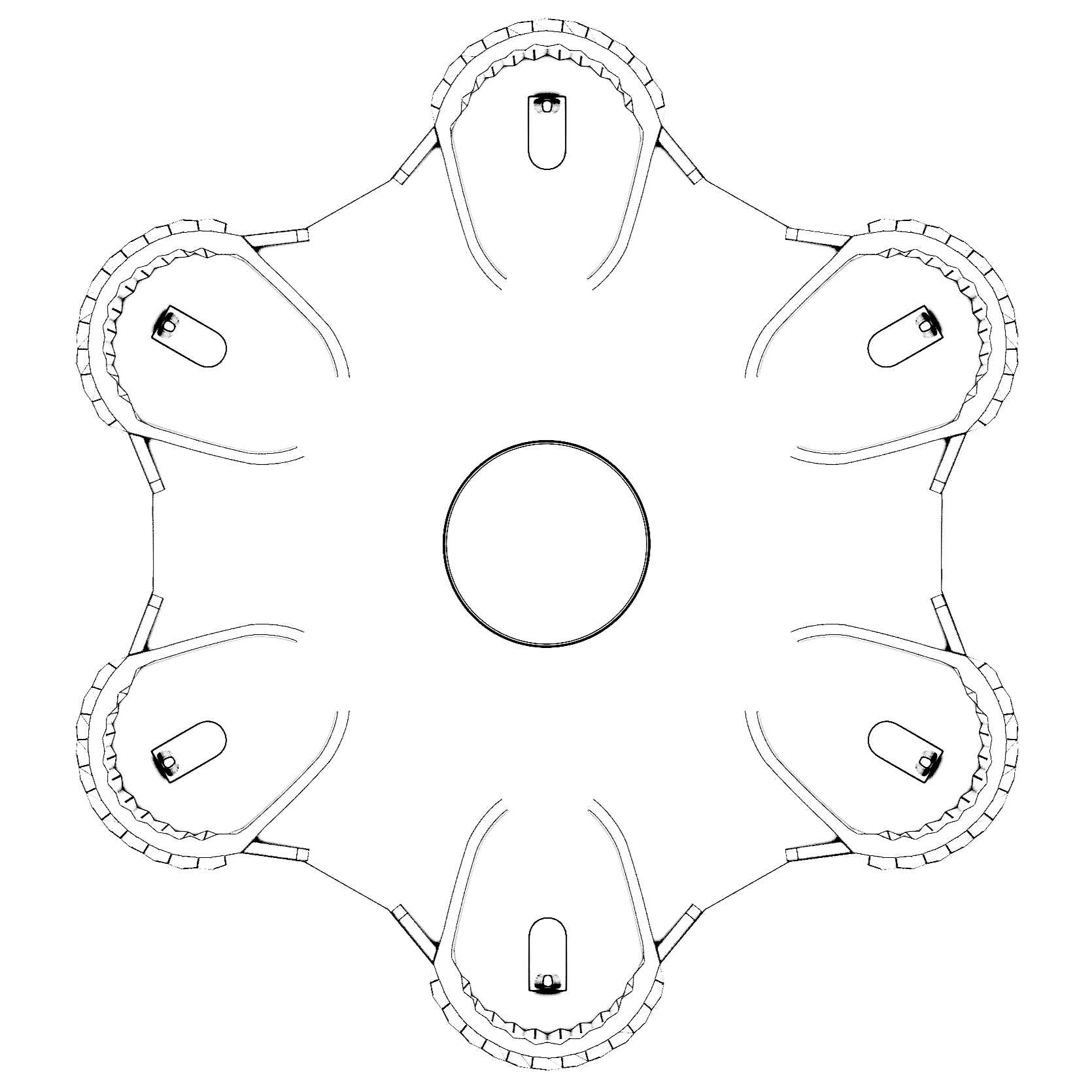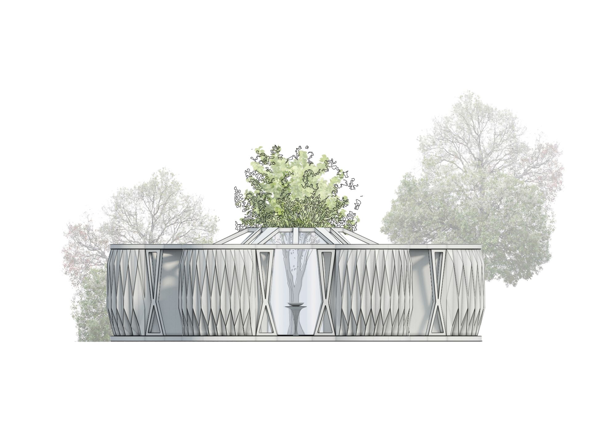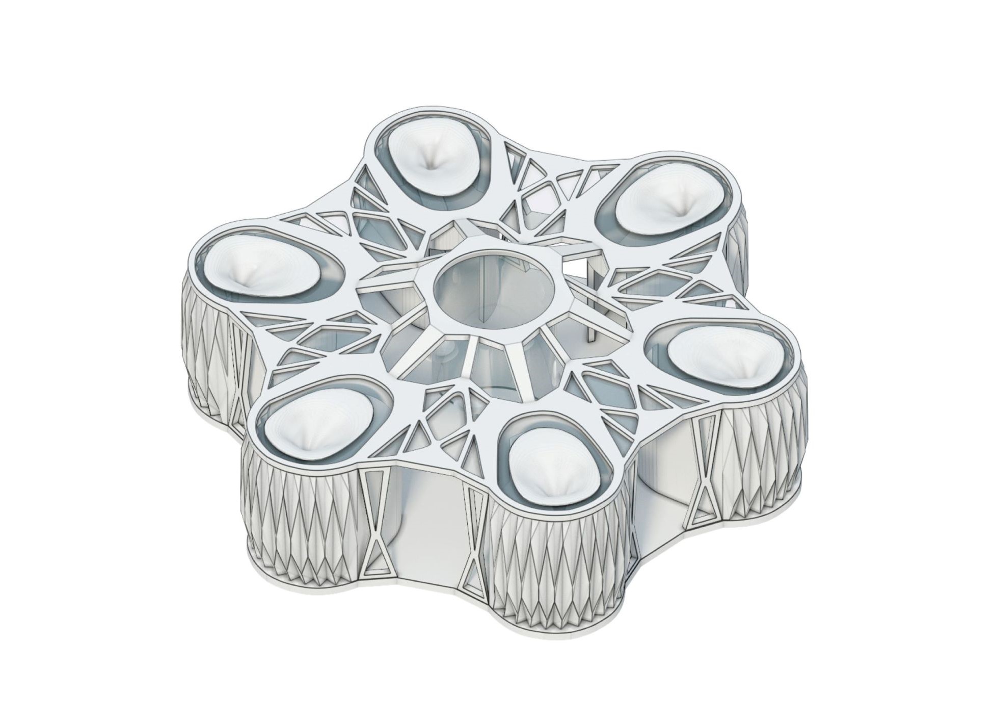 Diese architektonische Studie zeigt den Entwurf eines öffentlichen WCs, das Funktionalität, Nachhaltigkeit und eine organisch inspirierte Ästhetik vereint. Die Form des Baukörpers orientiert sich an den weichen, fließenden Kunstformen mariner Lebewesen. Die symmetrische Struktur aus sechs identischen Zellen mit dazwischenliegenden Eingängen ermöglicht eine klare, intuitive Orientierung.