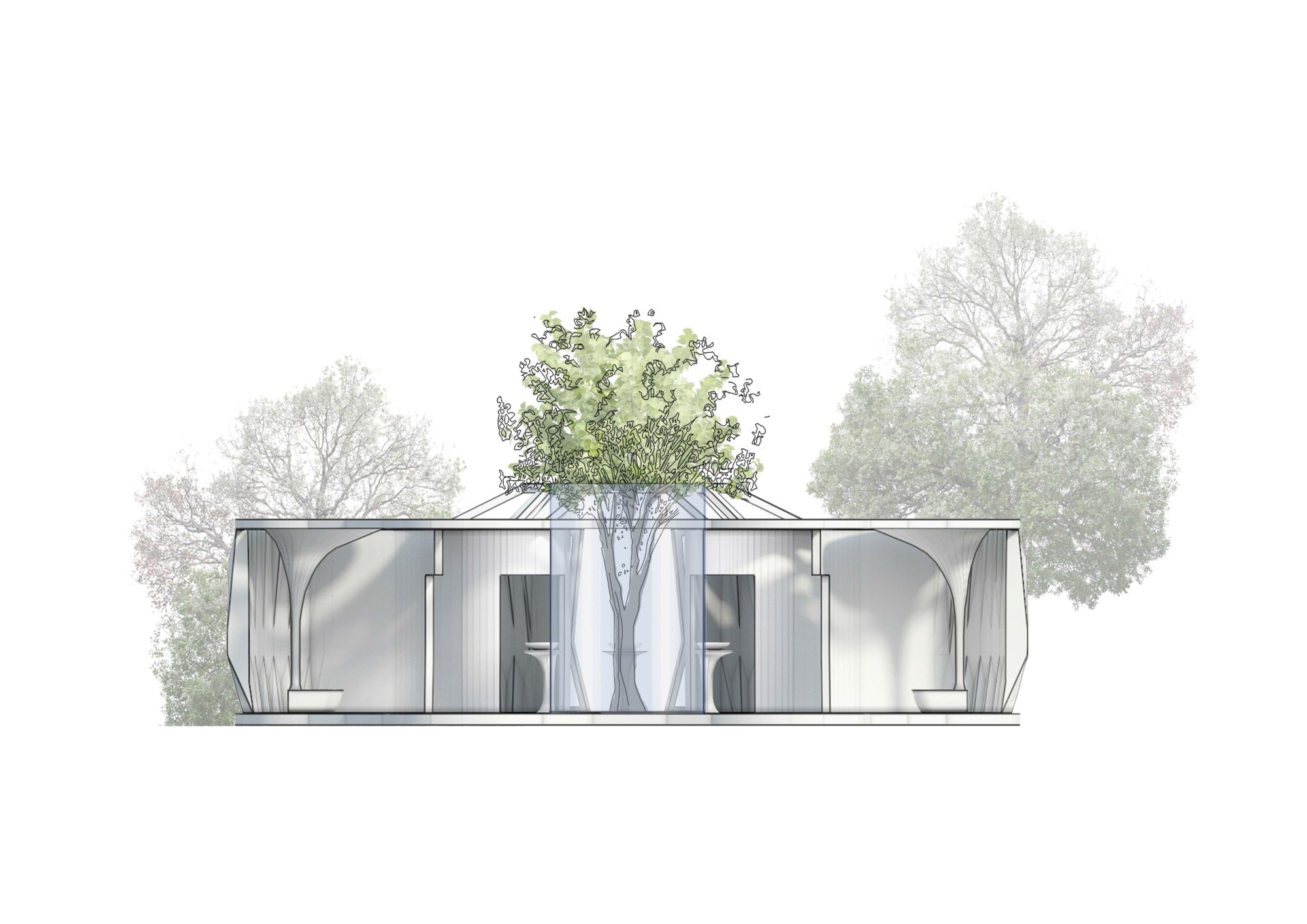 Im Zentrum öffnet sich ein großzügiger Lichthof mit einem Baum – als stilles Zeichen für Leben, Ruhe und Wandel. Durch die filigrane Dachstruktur fällt sanftes Tageslicht in den Raum und erzeugt ein atmosphärisches Spiel aus Licht und Schatten.